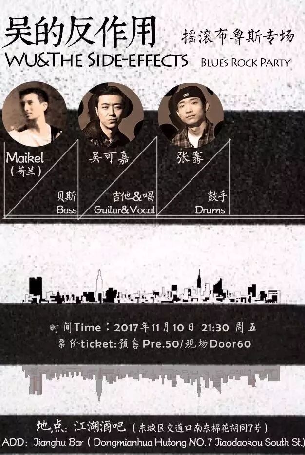 吴的反作用乐队成立于2003年11月,是一支在国内独树一帜的Blues摇滚乐队,他们的音乐有着深谙Jimi Hendrix摇滚精髓的背景,沿袭根源Blues的传统,加入了Funk节奏,并且以宗教,哲学,诗歌作为音乐的精神依据,使之得到更富有生命力地挥发,像一棵树一样热情地,执着地,坚强地信守着他们的后英雄主义情怀。