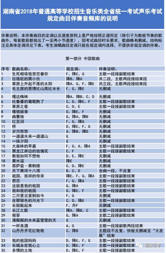 附件:1、湖南省2018年普通高等学校招生音乐类全省统一考试声乐考试规定曲目伴奏音频库的说明