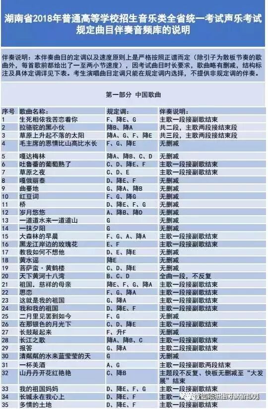 附件:1、湖南省2018年普通高等学校招生音乐类全省统一考试声乐考试规定曲目伴奏音频库的说明