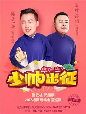 2017郭麒麟、阎鹤祥这对当红组合将首次举办相声专场全国巡演。此次相声专场全国巡演主题定为“少帅出征”,寓意经过数年演艺磨砺的郭麒麟,如今已经成熟能够独当一面。作为90后的他,誓要靠实力开拓出德云社一片新的疆域,为相声艺术注入新的活力!