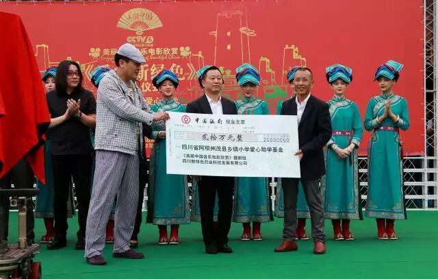 开机仪式现场《美丽中国音乐电影欣赏》摄制组、四川新绿色药业科技发展有限公司共同向茂县乡镇20所小学捐赠人民币20万元,用于精准扶贫爱心助教,让爱延续。
