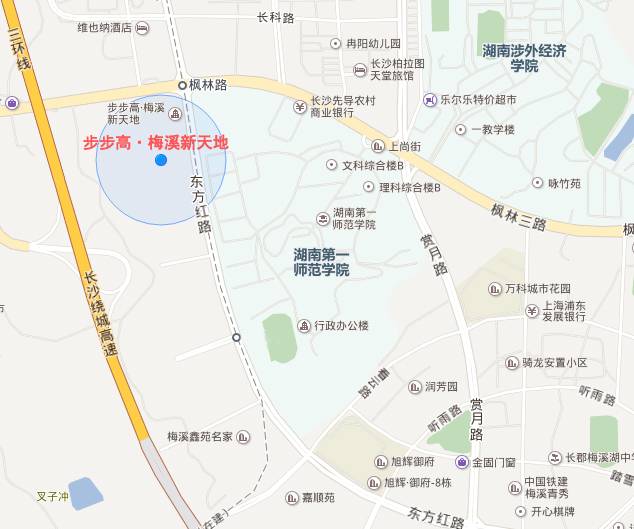步步高梅溪新天地位于咱们大长沙岳麓区枫林三路与东方红路交汇处,与麓谷汽车世界、长沙第一师范、涉外经济学院相邻。