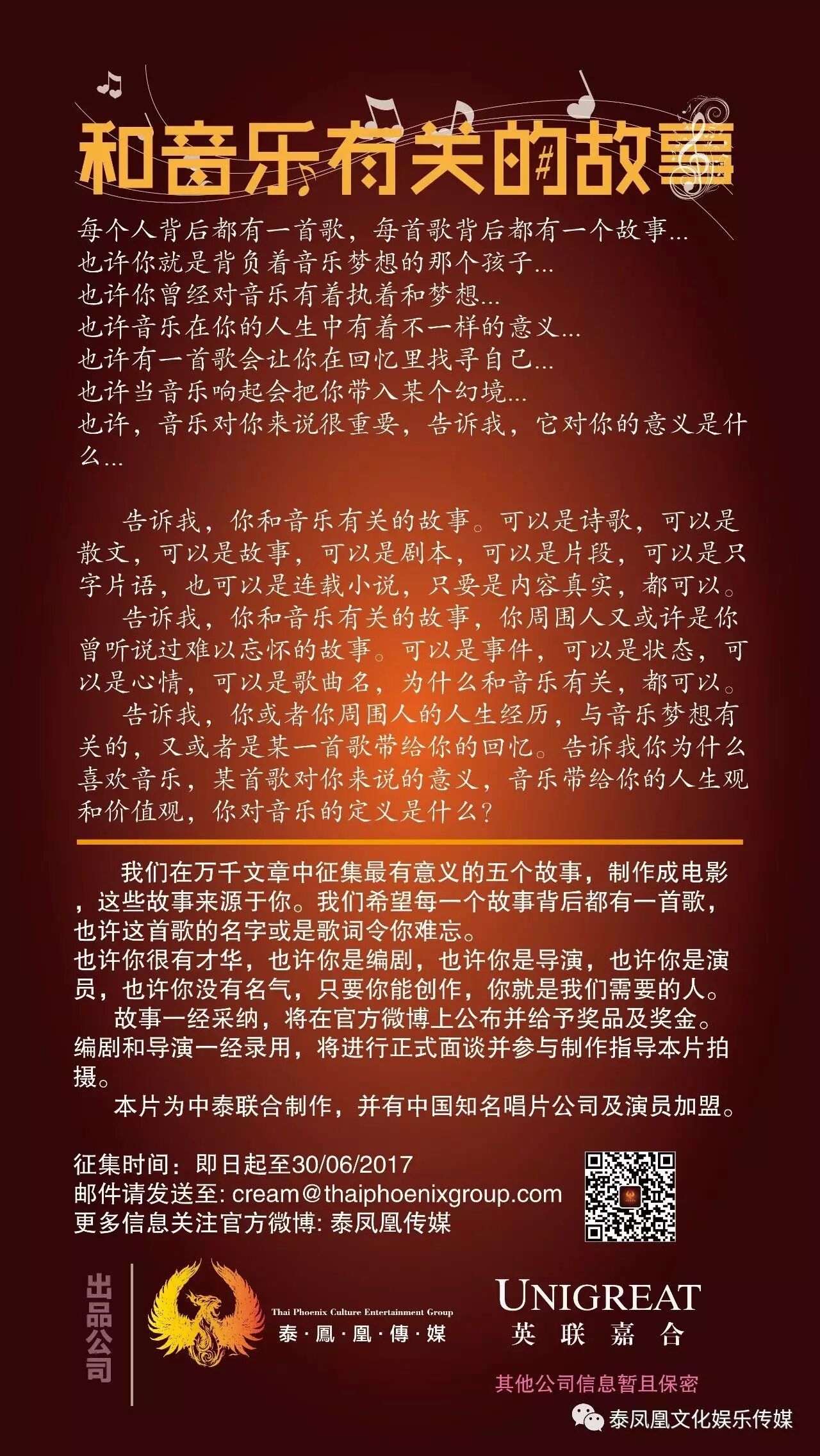 泰凤凰文化传媒一直致力于中泰文化的交流与合作,2017年《爱尚泰国》电影即将问世。泰凤凰文化传媒公司又将眼光放在了下一步经典作品上。从作品的启动工作开始,泰凤凰就把追求影片的品质放在了第一位。征集作品,是泰凤凰文化传媒新作登陆的第一步。