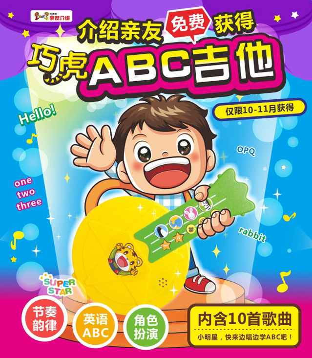 10月1日起,介绍亲友,即可获得【巧虎ABC吉他】1把噢!绝对的限时重磅大礼,仅限10-11月获得!