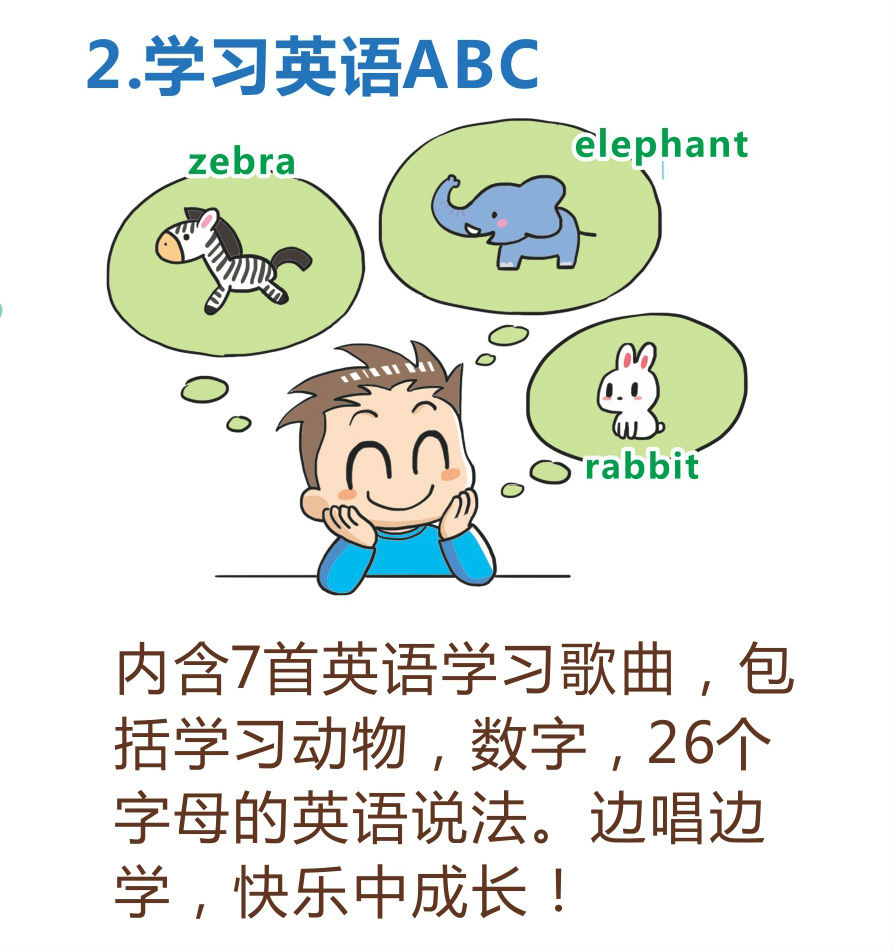 内含10首歌曲,可以唱歌,跳舞,打节拍,玩乐中快乐学习英语ABC!参加从速噢~