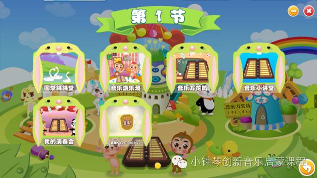 每一节下面包含的板块有:国学跳跳堂、音乐游乐场、音乐万花筒、音乐小讲堂、我的演奏会以及音乐SayGoodbye。