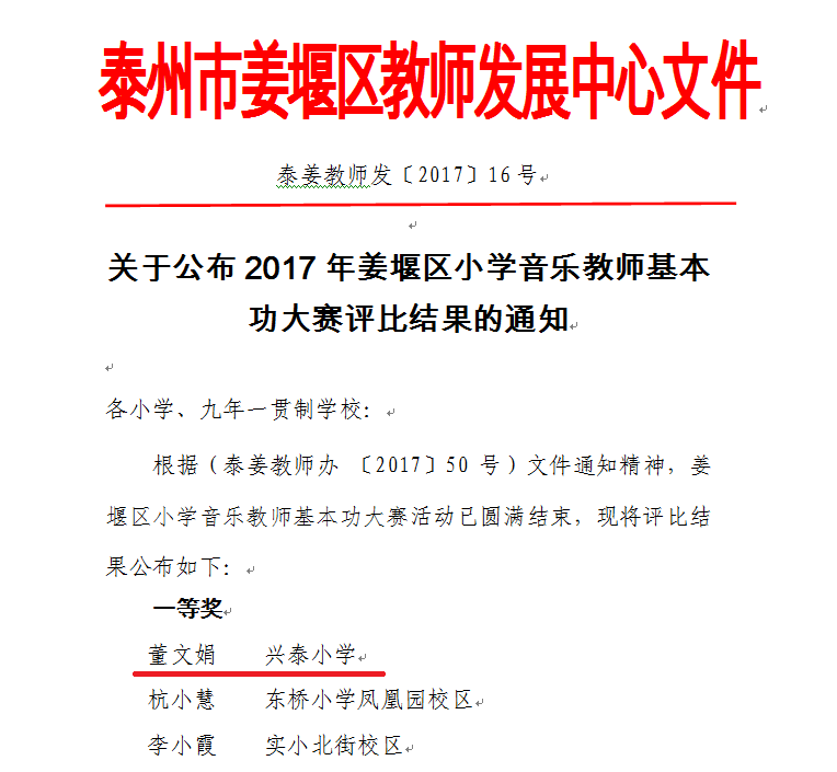 近日,从姜堰区教师发展中心传来喜讯:兴泰中心小学董文娟老师在姜堰区小学音乐教师基本功大赛活动中荣获一等奖第一名,并代表了姜堰区到泰州市参加更高级别的角逐与展示。