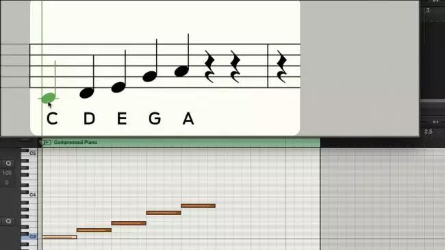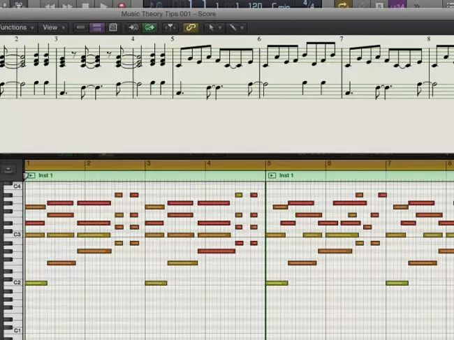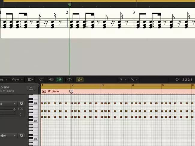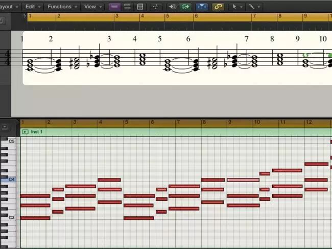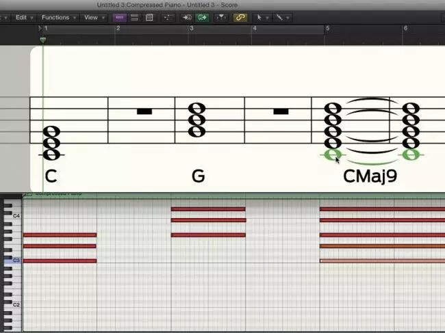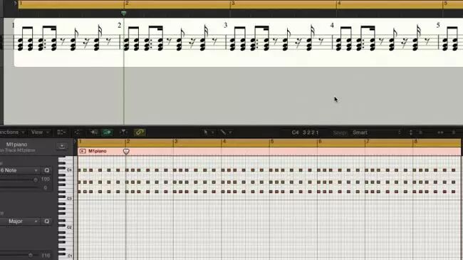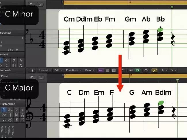 步骤1:举例来说明,例中的钢琴部分在不断重复C和弦,听上去十分枯燥。除了改变和弦,可以尝试从低音部分入手。