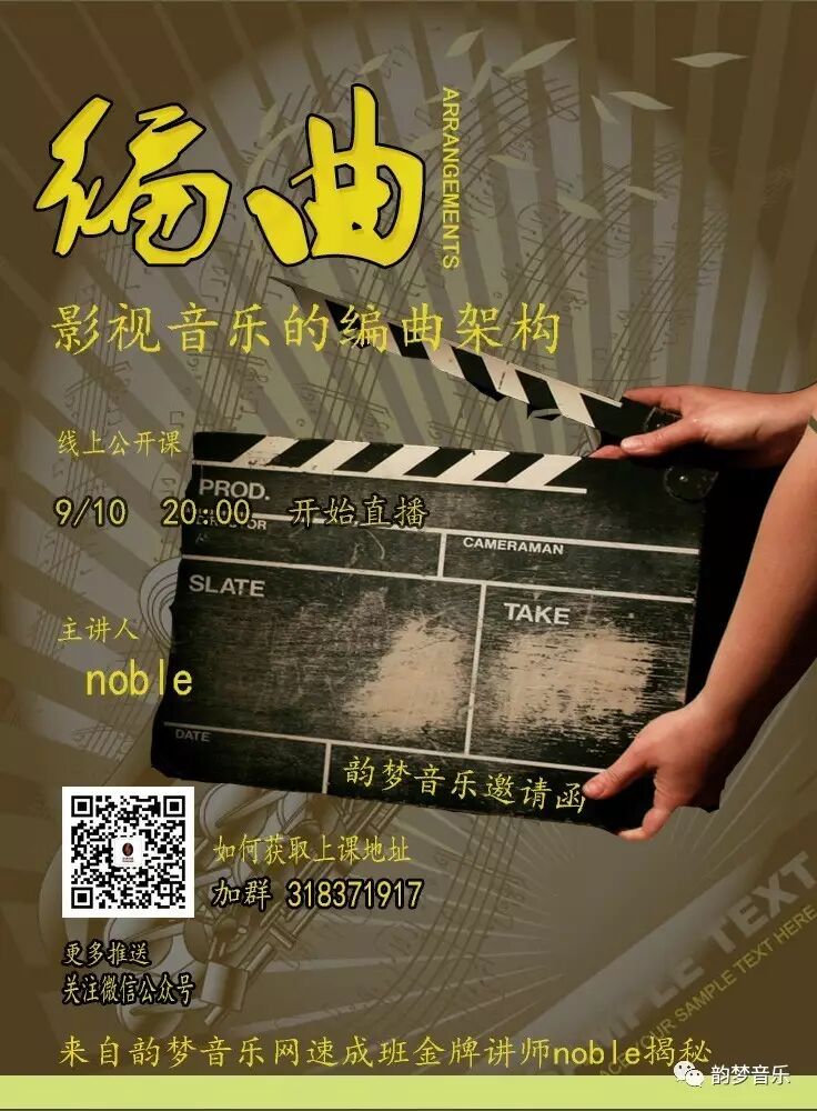 韵梦编曲速成班金牌讲师noble将会为你揭秘。影视音乐编曲的架构。