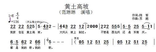 而民谣类华语歌曲则是结合民间音乐创作出的华语歌曲,这类华语歌曲与传统歌曲的风格相接近,早期的民谣乡村特色比较突出,强调旋律的浓厚,歌词多使用特色语言,描写特色环境,通俗易懂,节奏性较强,叙事鲜明,结构单纯完整。在中国的“西北风”歌曲《黄土高坡》、《中国功夫》、《篱笆墙的影子》都是此类型中代表之作。其包含了山歌节奏自由、旋律线悠长以及西北人民族特有的豪迈演唱手法,如在《黄土高坡》中的一段: