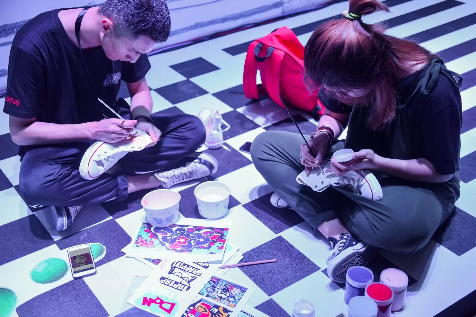 涂鸦区也提供颜料、画笔。匡威等潮牌派有专人指导 DIY,也任大家自由选择手绘图案,一个帆布包处女作就尴尬诞生,画得丑点没关系,真实最重要。