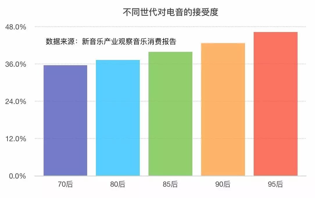 从上图中,我们看到,电音在不同世代的“渗透率”不断提高。70后最低,35.6%,到95后最高,接近50%。显然,听众越年轻,对电音的接受度越高。