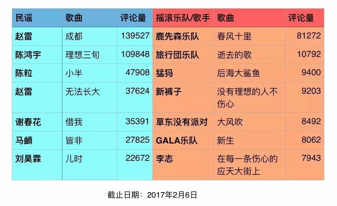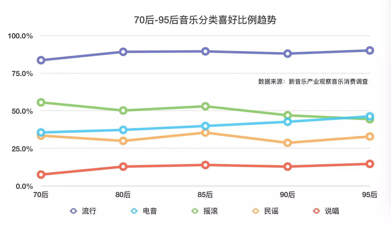 从数据看,摇滚市场显然远不如民谣市场。加上90-95后接受度逐渐下降,根据这个趋势,我们预计,未来三年内,除非出现一个超级明星,不然摇滚乐的市场将会逐渐萎缩。