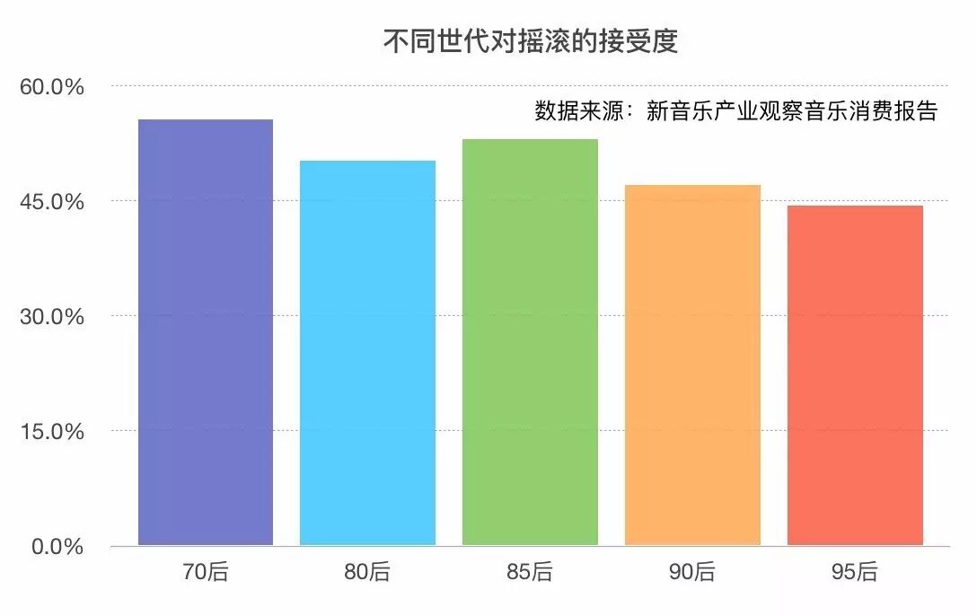 趋势中,我们看到,摇滚在不同世代听众中,“渗透率”不断降低。70后受访者中喜欢摇滚的占到半数以上(55%),到95后则跌到44%。