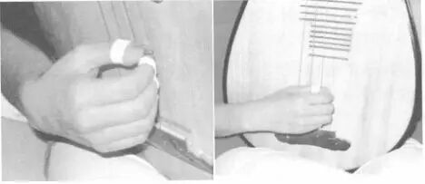 (1) 触弦(拨弦发音)的位置有变化,产生音色的变化。触弦,经过弦 时,越接近缚弦处音色越硬;越靠近弦身二分之一处,音色越松。