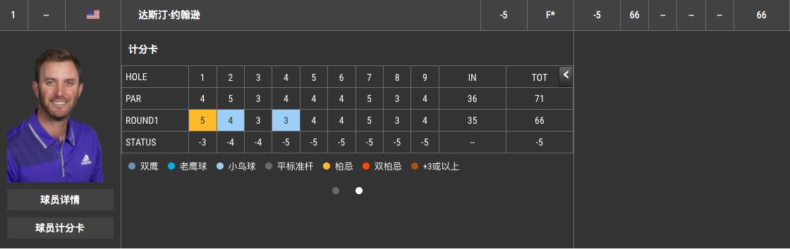 2017美巡季后赛第二站,戴尔技术赛首轮战罢,联邦快递积分领先者达斯汀·约翰逊强势开启第一轮,DJ在上周加洞赛打败乔丹·斯皮思,最终赢得了北方信贷赛,本周依然延续着火热状态,DJ不但发挥着自己大炮手的威力,在推杆上也是顺风风水,在18号洞的5杆洞上,两杆攻上果岭小球停在洞口近一码的距离,一个几乎是OK的老鹰DJ当然不会放过,最终DJ整场抓下5只小鸟,射下一头老鹰,吞下2个柏忌,交出66杆低于标准杆-5杆领先第二名1杆暂时排在第一位;