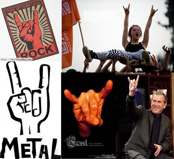 金属礼,原是地中海一带国家趋避邪魔(甚至有污秽粗俗之意)的一种手势——该手势就像里象征着“魔鬼”的山羊角。所以这一手势当年是上不得大雅之堂的,后来还被撒旦教用作表示魔鬼的手势。