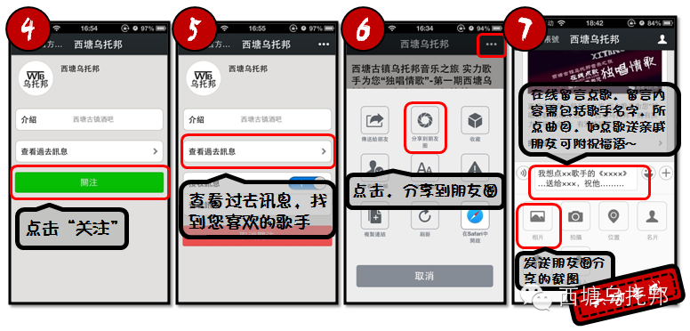 1、关注西塘乌托邦微信公共平台,查看历史消息,寻找您喜欢的歌手,并转发该条消息至朋友圈并截图;