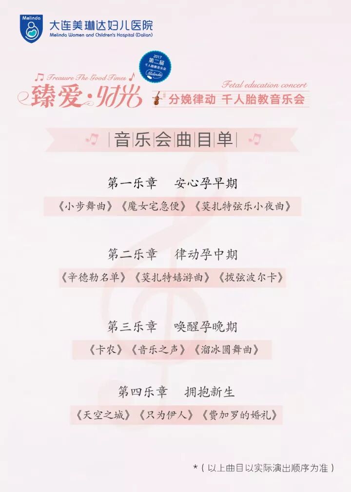 本次胎教音乐会,美琳达特别邀请了大连万皇国际交响乐团、大连电视台新闻频道知名主持人小赫等艺术传播者,特邀大连电视台《新闻锋线》知名主播东伊、大连电视台《快乐驿站》/《天气预报》知名主播薏菲,明星辣妈们将亲临互动,以及多名妇产科大牌主任,亲临现场与孕妈妈们面对面交流。引导孕妈妈们科学胎教,用视听胎教及胎教互动,将科学孕育、智力开发、胎儿情商培养融为一起,呈现了一场具有艺术气息的年度视听胎教音乐会。