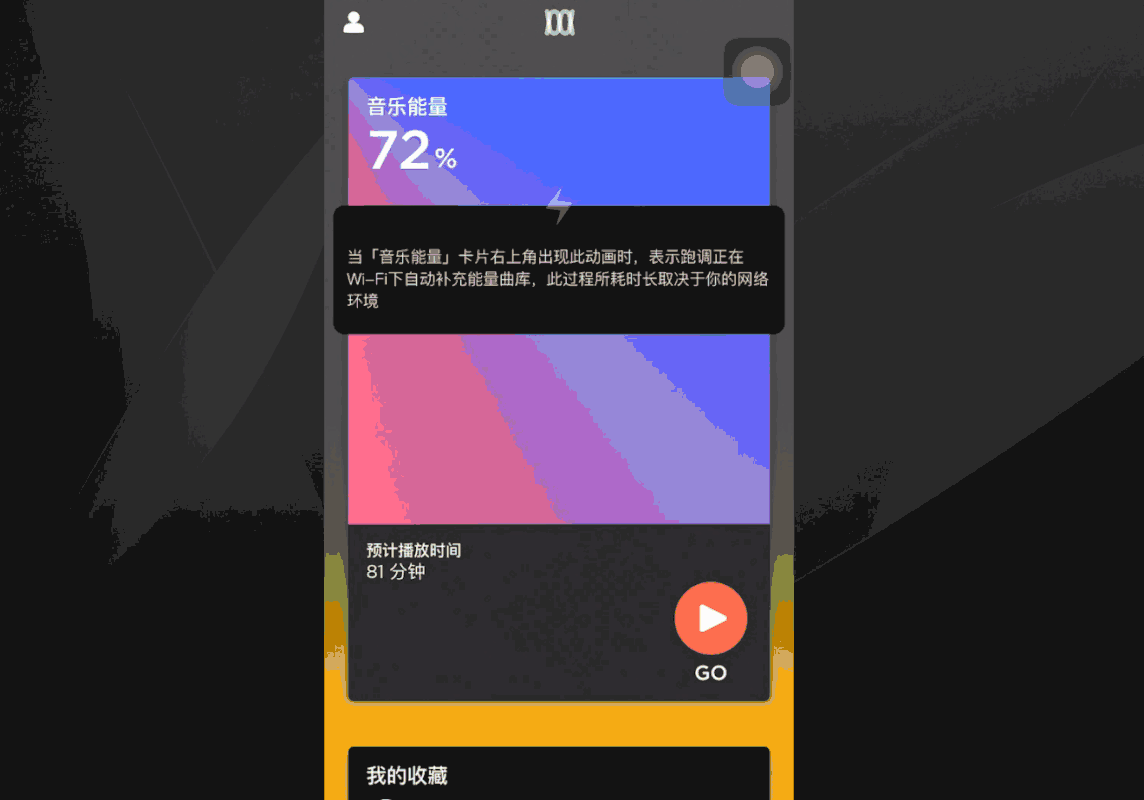 点击这里的 GO 就可以开始播放了,遇到不带感的音乐可以点击两次进行切歌,点击三次即可收藏,操作还是比较方便的!收藏后可以在刚刚的主界面中找到。