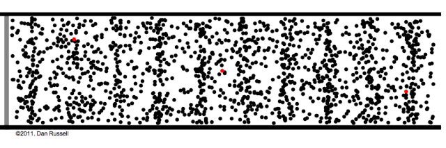 但在空气中,声音其实是以纵波的形式传递振动的,就像下面的动图,其中每个黑点是空气中的分子,分子的振动方向(左右)和振动的传播方向(向右)相同: