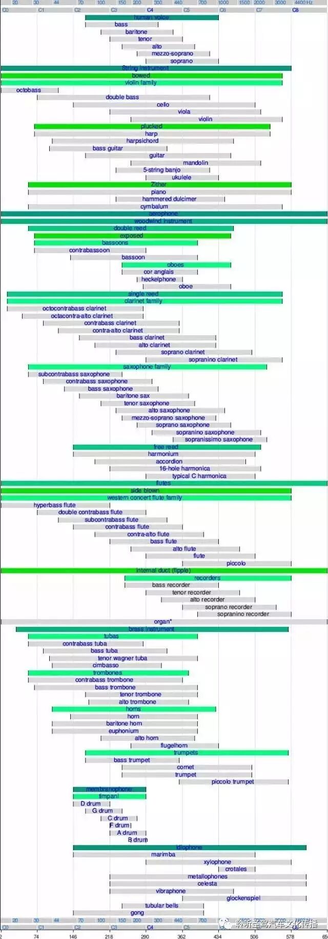 关于有损音乐格式,比如mp3,它压缩的方式是去掉音频中部分的高频来实现的。因为对于人来说,虽然能听到的频率上限是20000Hz,但是在一般的歌曲中,高频部分其实并不多。下图【9】表示了一些乐器所能发出的频率范围,可以看到,钢琴能发出的最高频率的声音不到5000Hz,人声在80-1000Hz的范围。