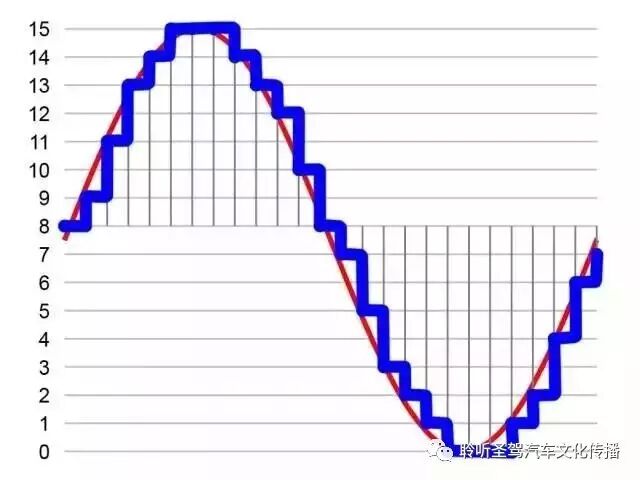 当然像对于这样粗糙的分割,连线得到的波形和原始波形还是有很大的差距的,上图的粗糙一目了然。那怎么办?那就细分呗,只要分得够细,就会够像,就像描点作图中选点越多就会越精确一样。一般情况下对于声音,一秒会被分成44100份,“最大振幅”到“反向最大振幅”之间被分成65535份,这已经相当细致了。那么,为什么是这两个数字?