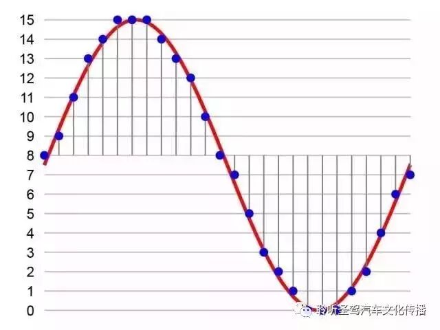 那么再回到声音上。其实和上面的例子一样,用数字完美复制真实声音的波形是不可能的,因此只要做到形状和真实情况非常近似——就像用数字描述的坐标点连成的线和“红线”看上去相似,这就可以了。操作上,就像描述红线一样,在声音波形图上“找点找坐标”,这种将真实生活中的信息(被称为“模拟信号”analog signal)转化为数字(被称为“数字信号”digital signal)的过程被称作“模数转化”(ADC/analog to digital conversion):
