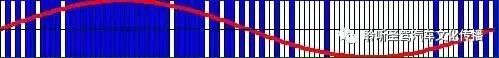 其实没必要过于追求这个技术细节……DSD格式的原理简要理解就是,用0和1的组合表示响度,如下图所示,蓝色块代表1,白色块代表0。当连续的蓝色块(或白色块)很多时,则说明这段时间的声音响度很大(可参考声音波形的红线)。
