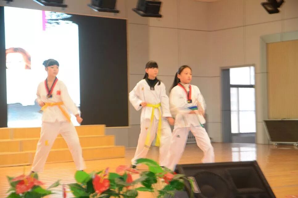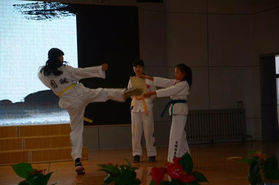 跆拳道以其变幻莫测,优美潇洒的腿法著名于世,被世人称为踢的艺术,田佳怡、杨婧怡、崔宇彤《跆拳道》表演