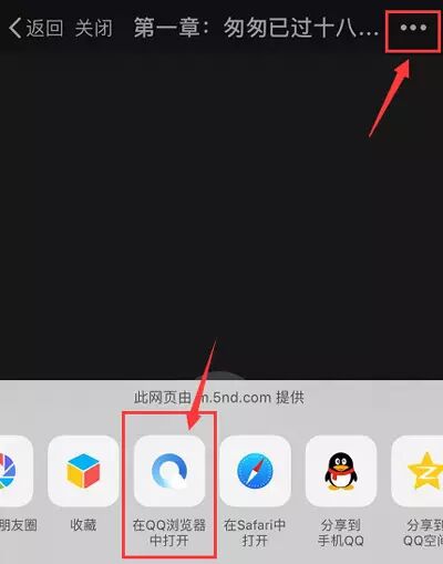 点击右上角“...”后,会在微信底部出现功能菜单,选"在QQ浏览器中打开",如下图: