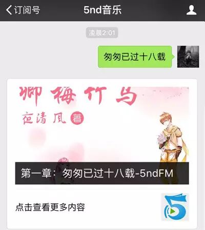 在5nd音乐公众号查询要下载的歌曲,比如输入“匆匆已过十八载”,5nd音乐公众号会返回给您相关的歌曲列表,如下图: