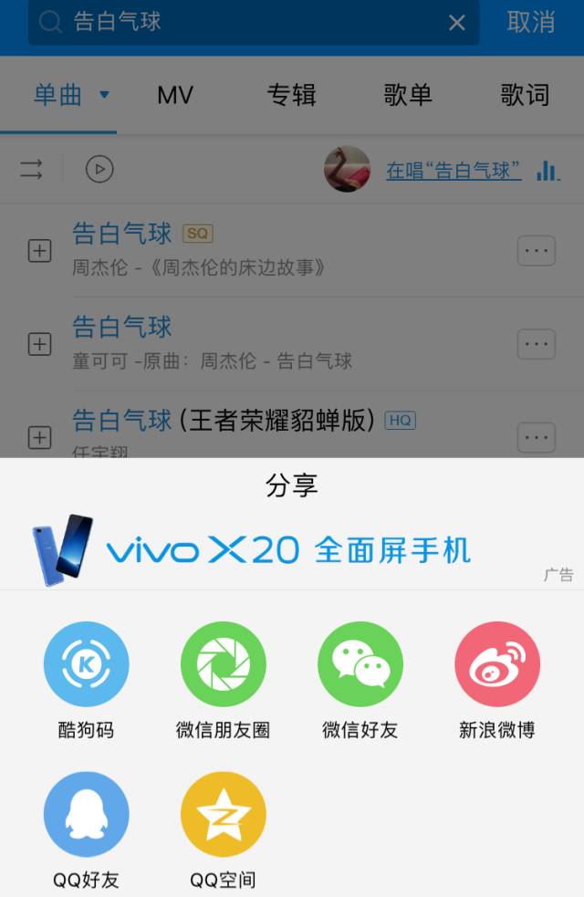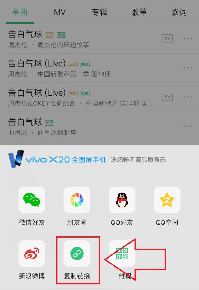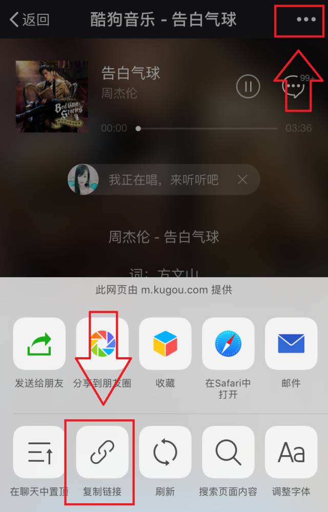 可以看到酷狗音乐分享页面是没有复制链接选项的,不过还是有方法的,可以选择直接分享到朋友圈、微信好友或者微博