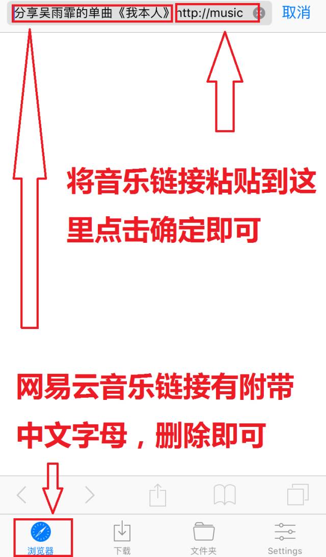 进入下载工具,点击浏览器页面,将链接粘贴到地址框中点击确认(注:网易云音乐链接自带有中文字样,将中文字样删除即可)