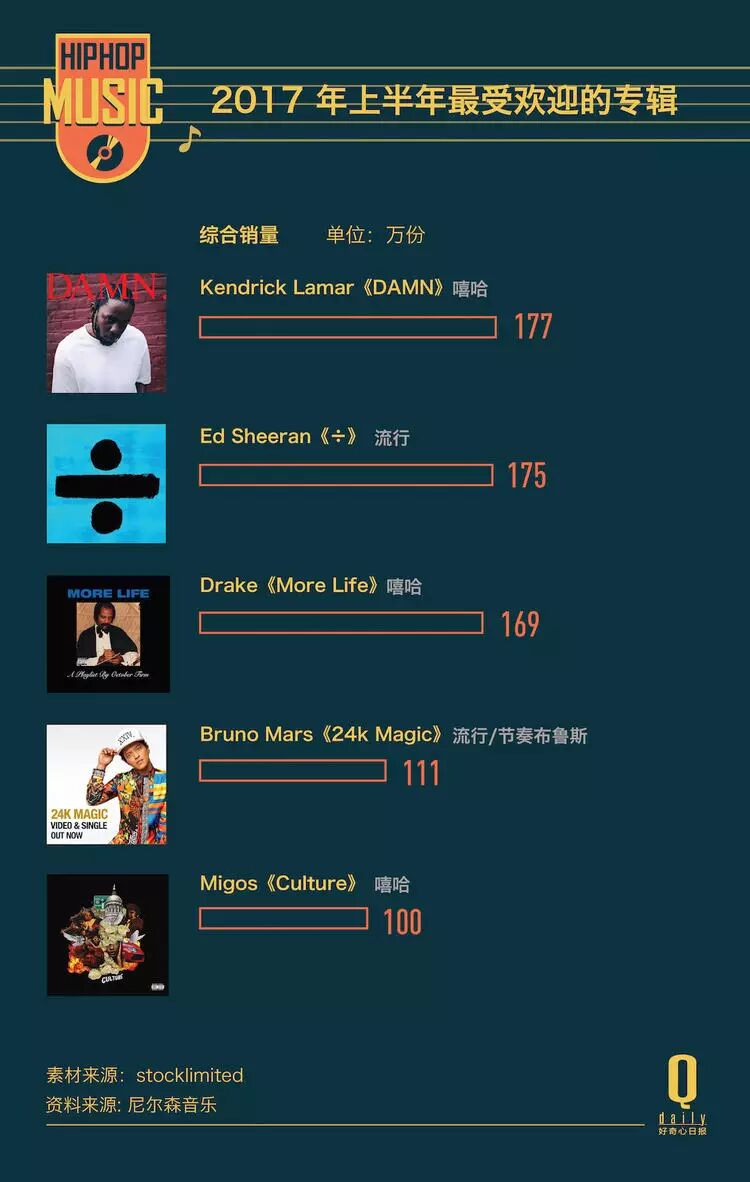 从下图可以发现,今年上半年最卖座音乐的榜单可以说是被嘻哈统治的。除了英国歌手 Ed Sheeran 的新专以外,其他几位的作品都和嘻哈(包含节奏布鲁斯)风格挂钩。
