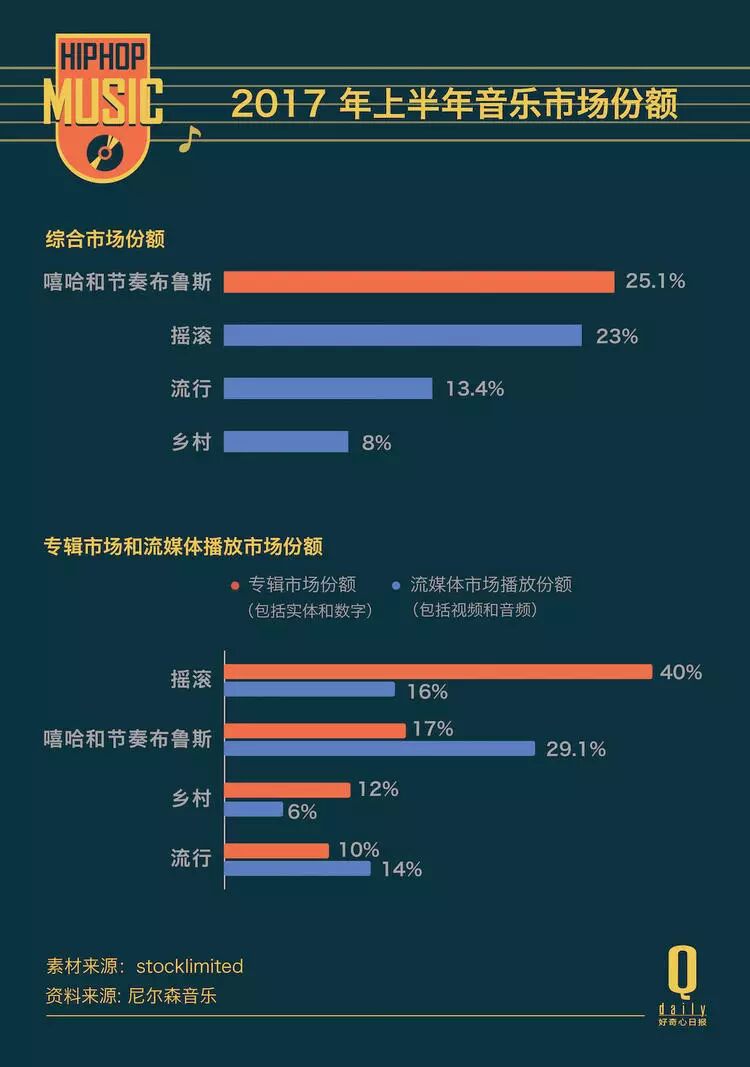 根据尼尔森音乐的统计,2017 年上半年音乐市场中,嘻哈(包括节奏布鲁斯在内)成为了最主流的类型,占到了市场份额的四分之一。这是尼尔森自 1992 年开始统计以来,第一次出现嘻哈成为最受欢迎音乐的情况。它把摇滚拉下了王座,后者占到的市场份额是 23%。