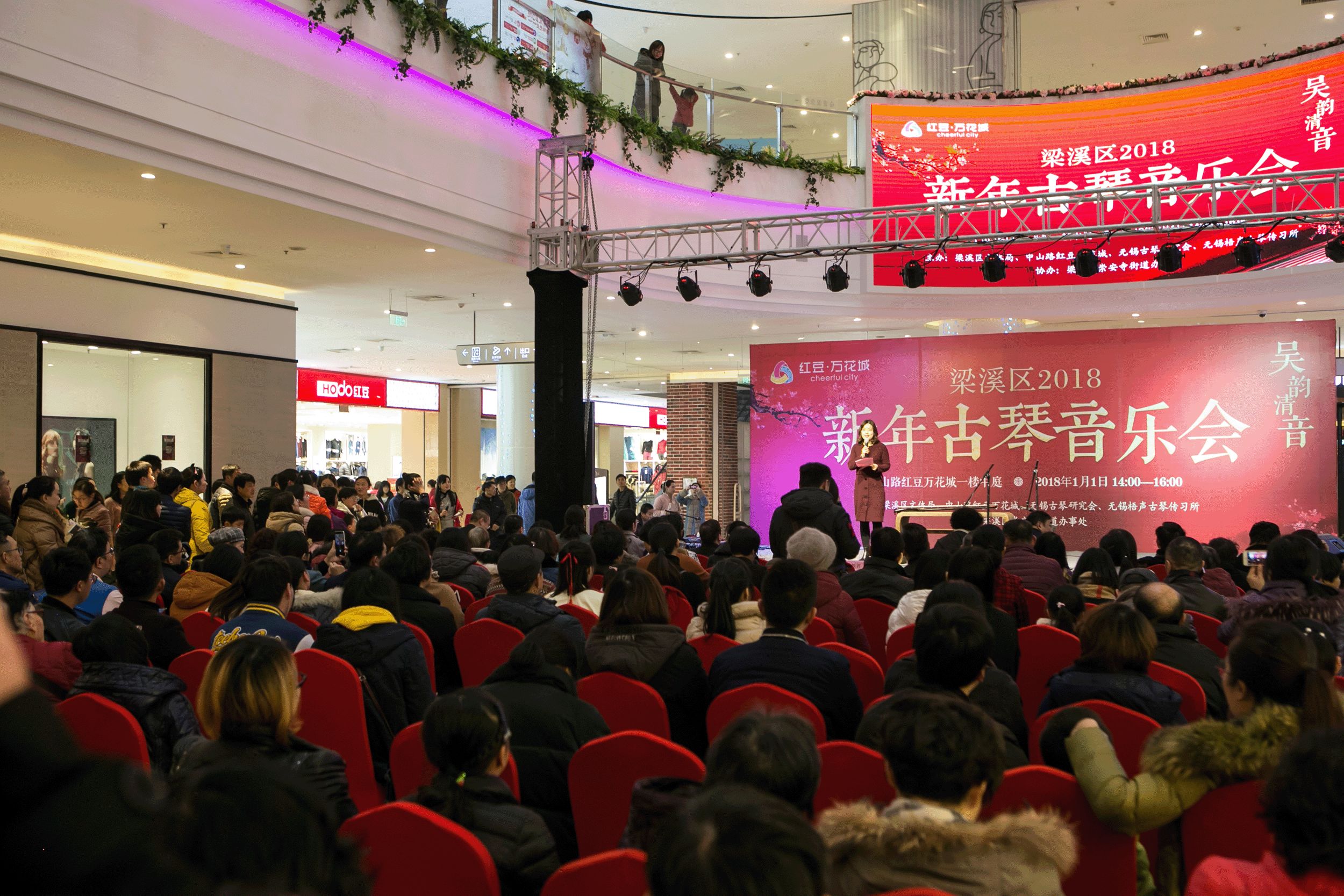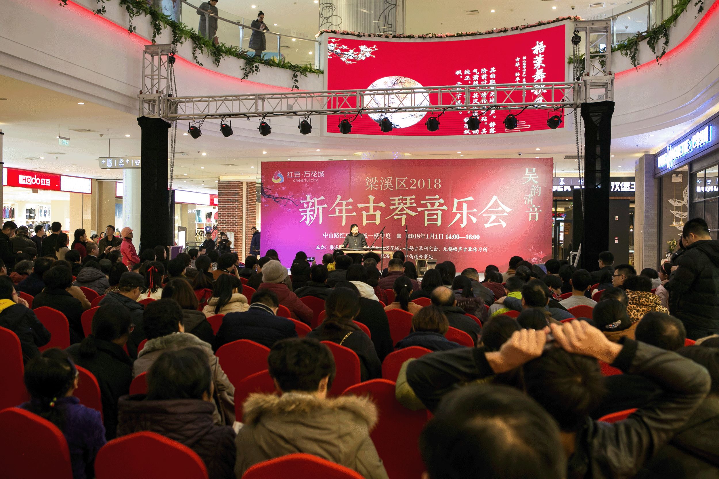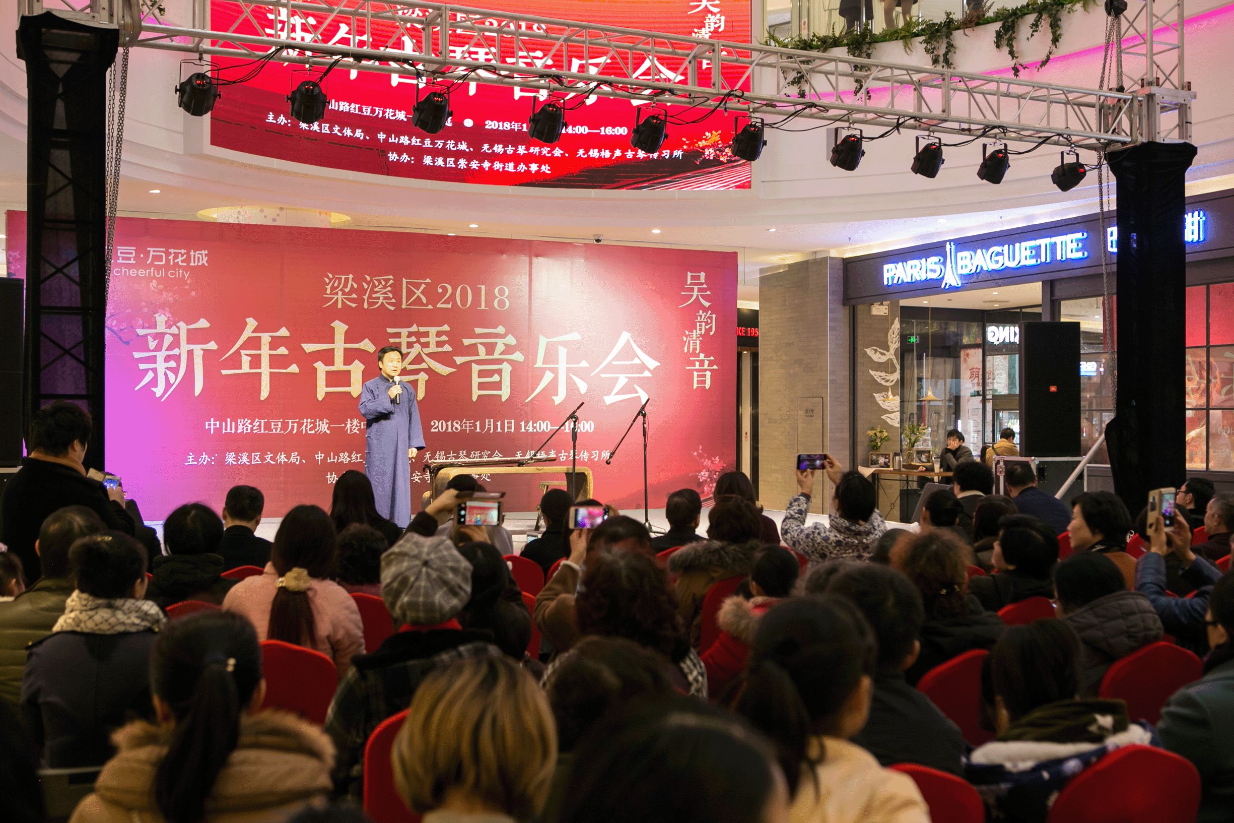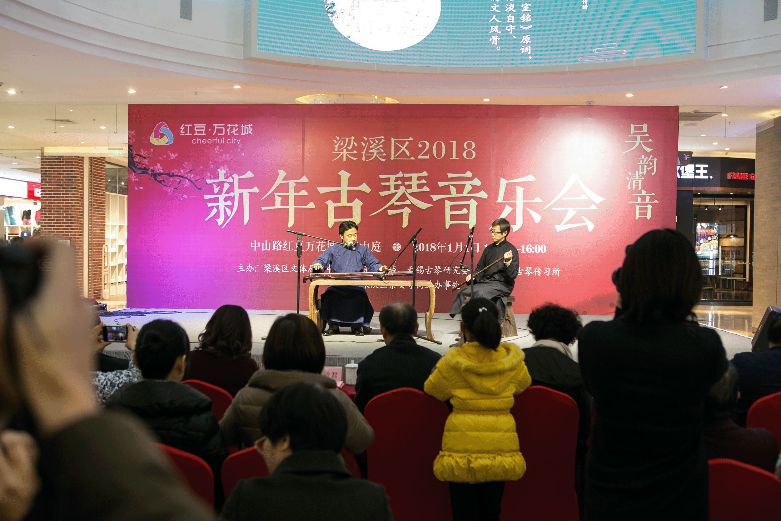 2018年1月1日,元旦佳节。市区一派节日气氛,热闹非凡。时近中午,中山路红豆万花城一楼的中庭,被一片喜庆的红色铺满,偶尔飘扬出的琴声、箫声在商场内回荡,吸引着过往的顾客。这是“吴韵清音”梁溪区2018新年古琴音乐会的现场,无锡古琴研究会、无锡梧声古琴传习所将在此为市民献上一道文化大餐。
