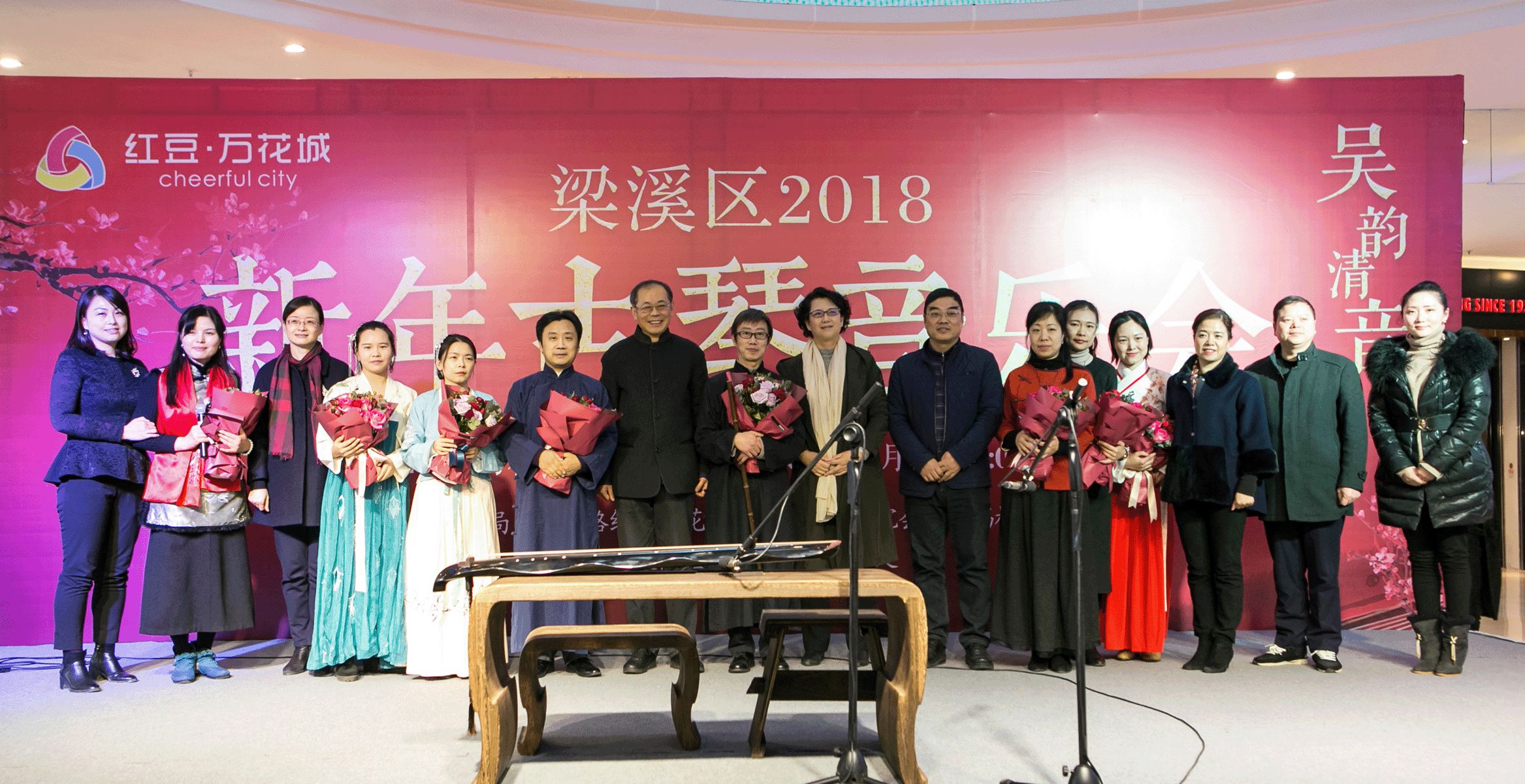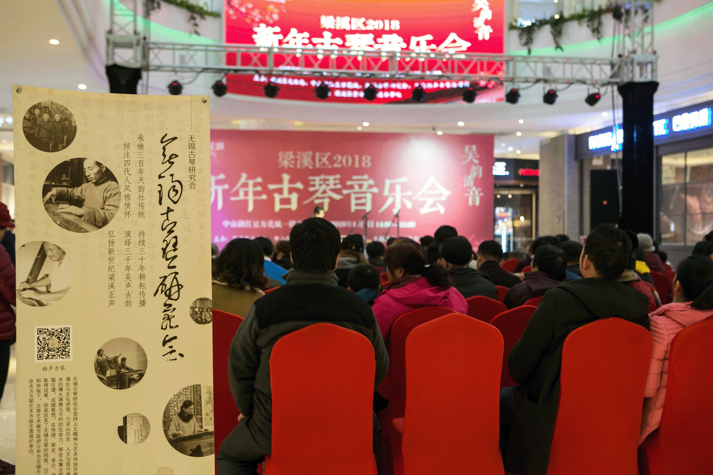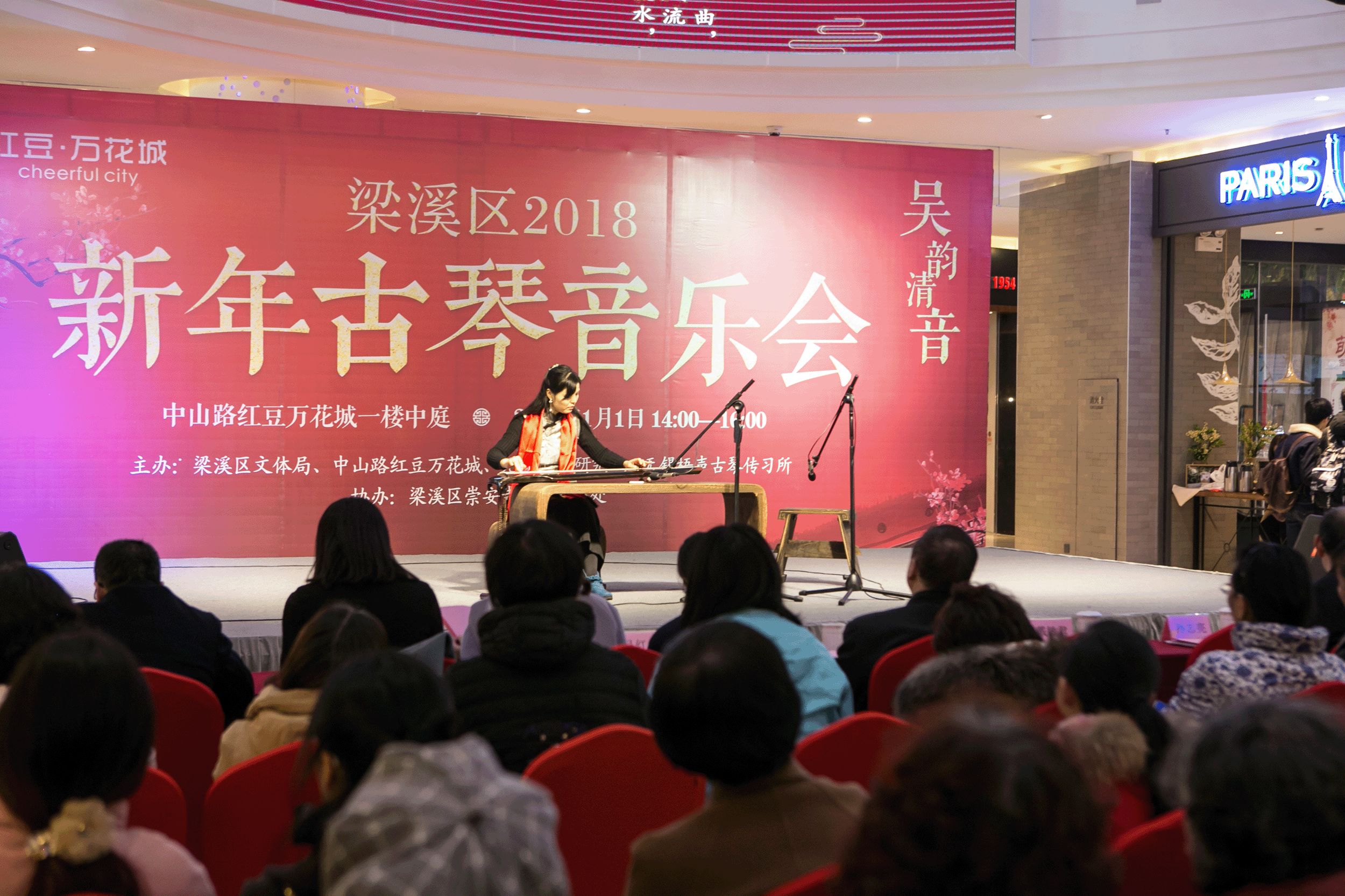 2018年1月1日,元旦佳节。市区一派节日气氛,热闹非凡。时近中午,中山路红豆万花城一楼的中庭,被一片喜庆的红色铺满,偶尔飘扬出的琴声、箫声在商场内回荡,吸引着过往的顾客。这是“吴韵清音”梁溪区2018新年古琴音乐会的现场,无锡古琴研究会、无锡梧声古琴传习所将在此为市民献上一道文化大餐。