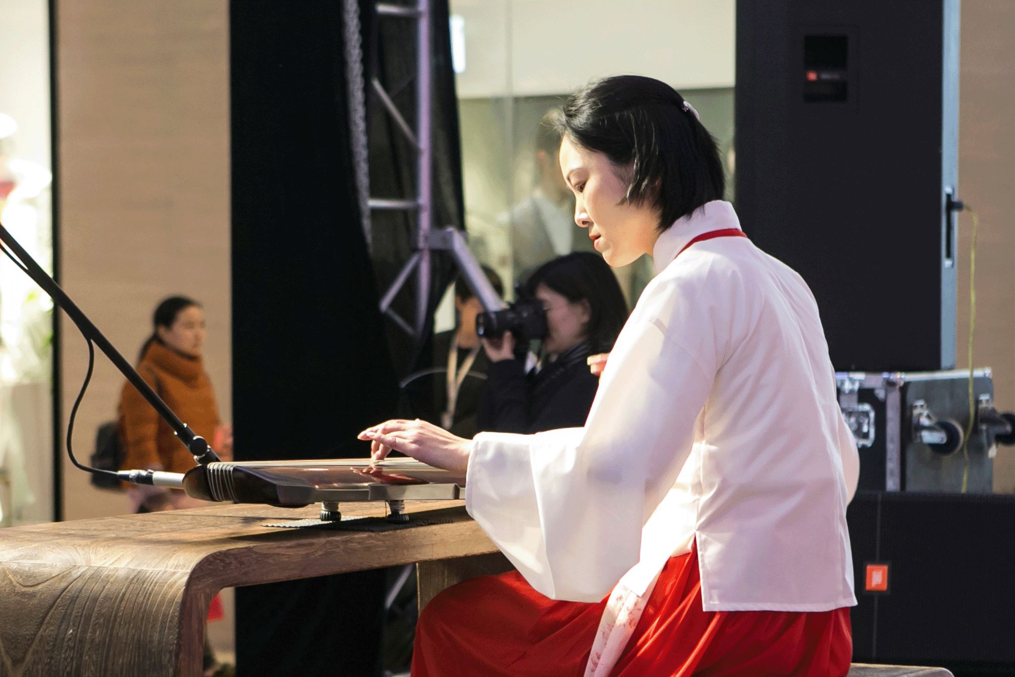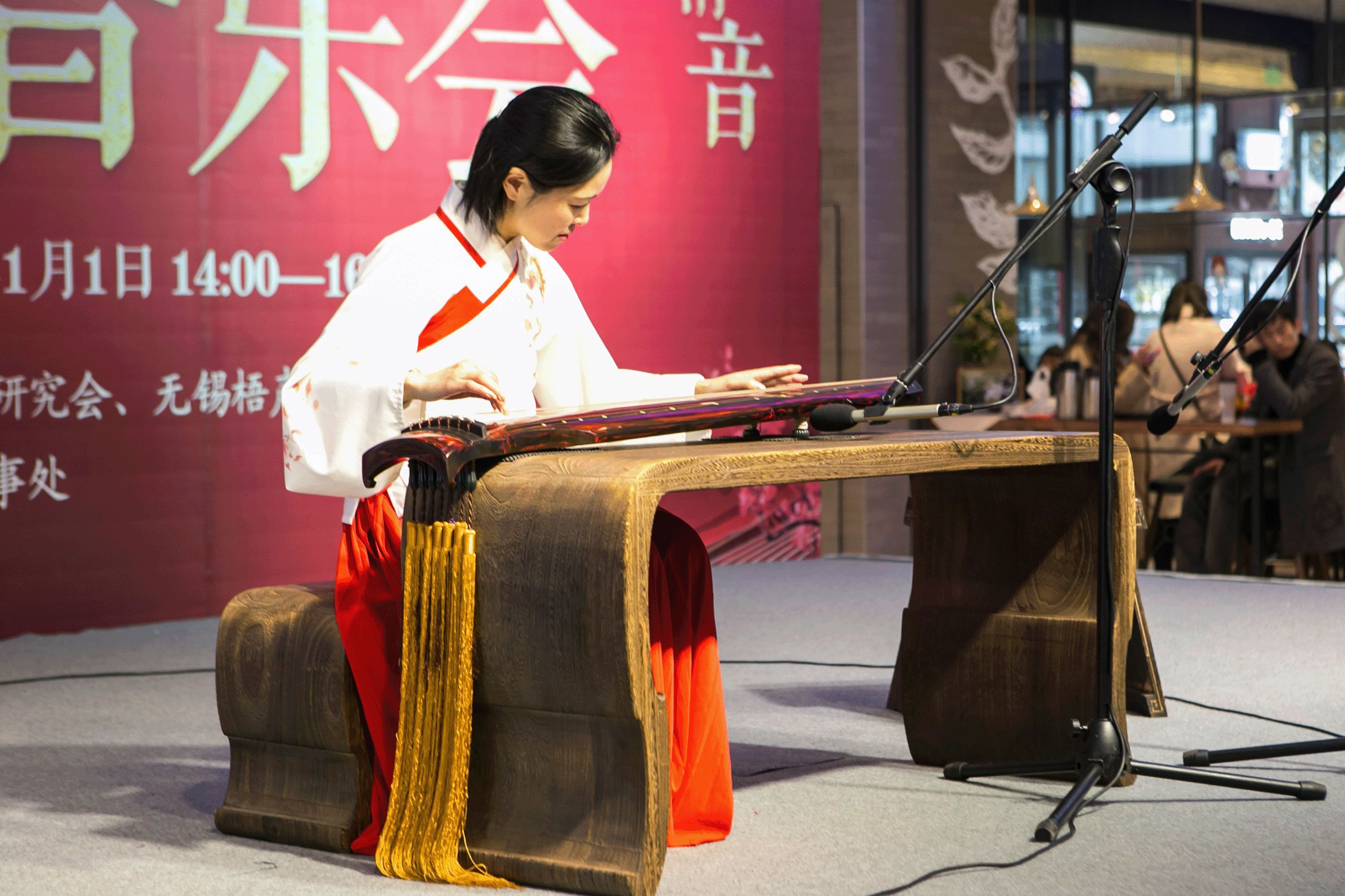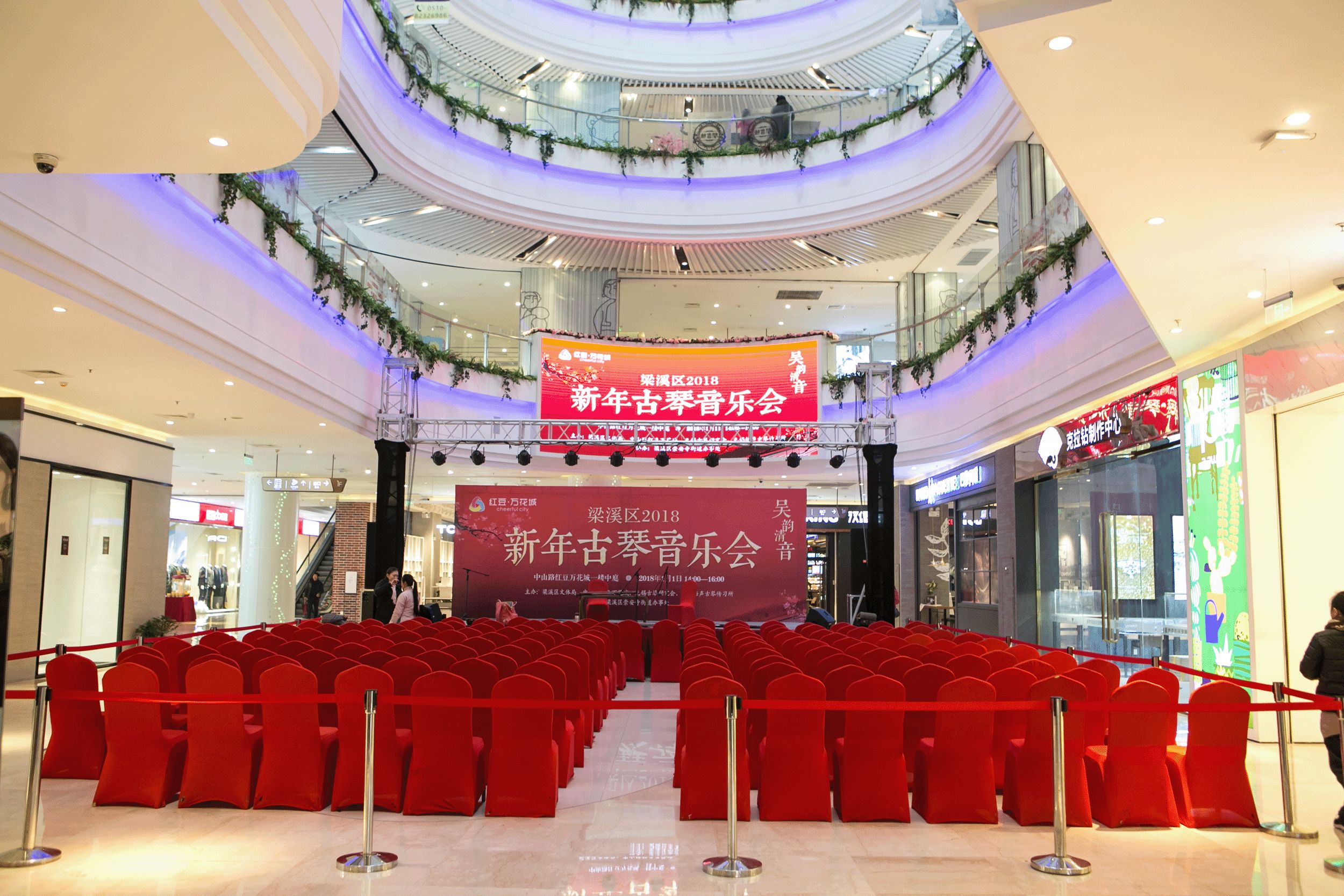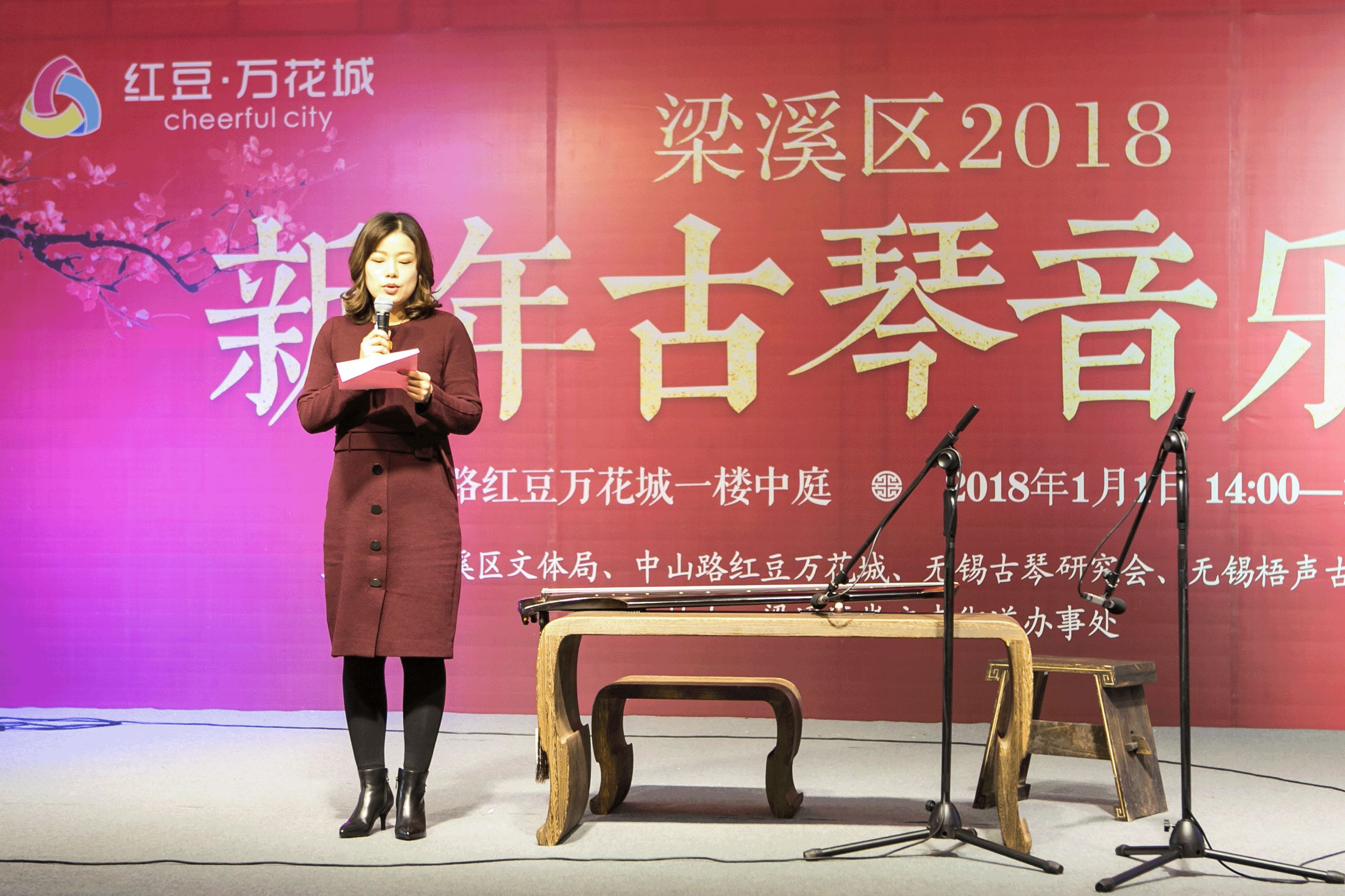 2018年1月1日,元旦佳节。市区一派节日气氛,热闹非凡。时近中午,中山路红豆万花城一楼的中庭,被一片喜庆的红色铺满,偶尔飘扬出的琴声、箫声在商场内回荡,吸引着过往的顾客。这是“吴韵清音”梁溪区2018新年古琴音乐会的现场,无锡古琴研究会、无锡梧声古琴传习所将在此为市民献上一道文化大餐。