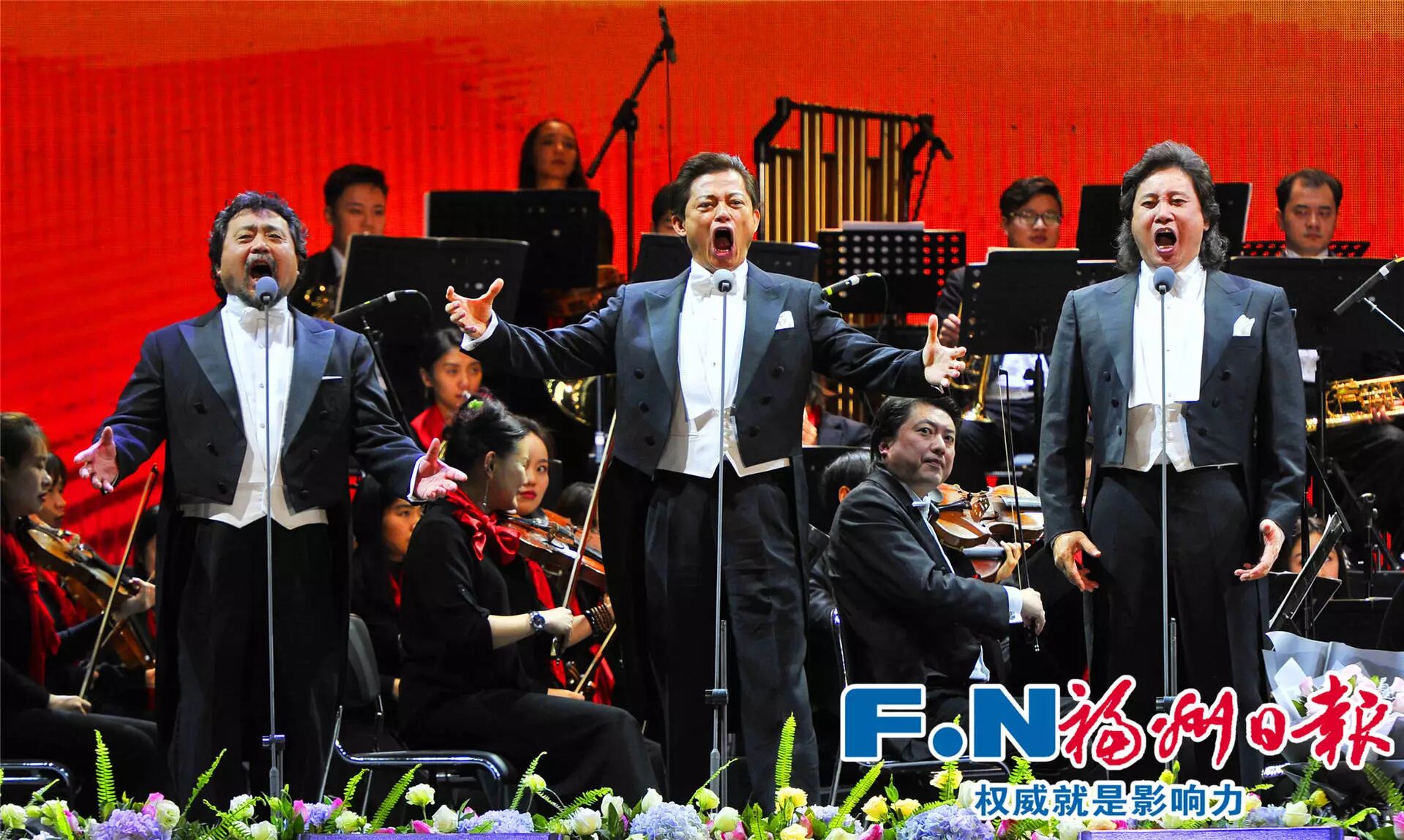 三大男高音魏松、莫华伦、戴玉强(从左至右)为榕城市民献唱