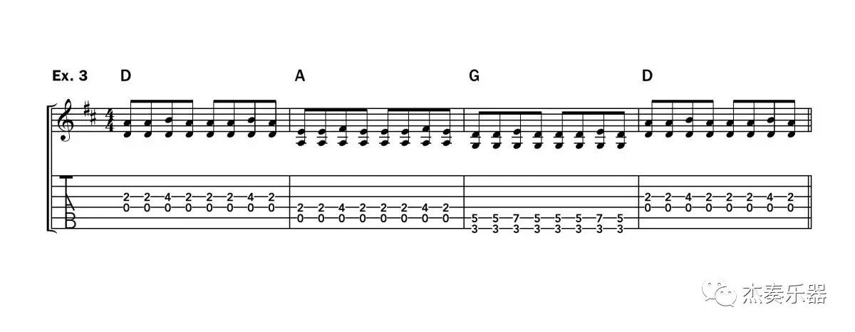 建议将此节奏型运用尝试的曲目:Beatlegs - “Revolution.”用八分音符演绎布鲁斯摇滚版Chuck Berry-“Johnny B. Goode”或the Beatles- “Come Together.”