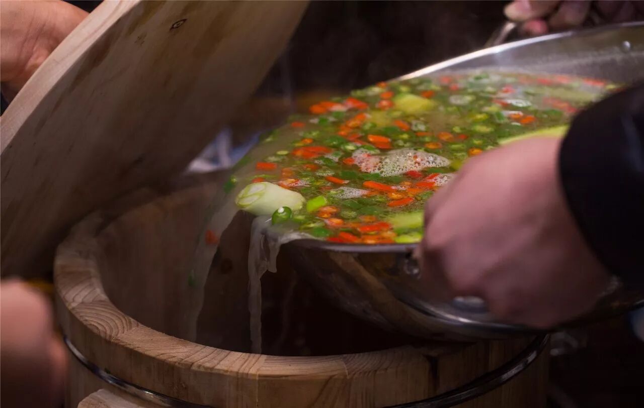 吃慕希的木桶鱼,一定不能错过美味的鱼汤,不要看汤色清澈,但是鱼的香美已经浸入其中,上面漂浮的青红鲜椒是神来之笔,入口绝对爽辣鲜美,欲罢不能!