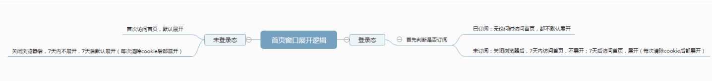 我们知道,如果一个弹窗每次都在页面上打开,这是非常损害用户体验的。因此,为了避免严重损害用户体验,对于首页窗口是否默认展开,以“用户是否登录”这个状态作为判断节点,我们采用了如下规则: