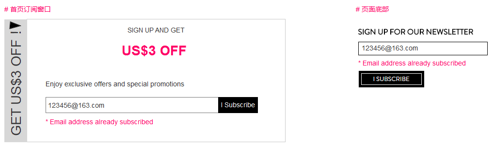 基于以上规则,当用户用同一个邮箱重复订阅时,首页窗口 or 页面底部都会提示用户“该邮箱已订阅过。”