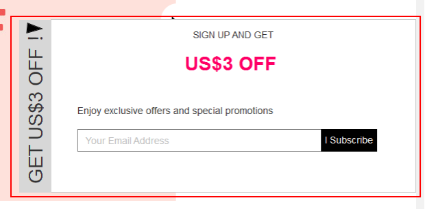 窗口上的引导条文案(“get us$3 off”),促销信息(“us$3 off”)等内容都是由运营通过后台配置的。窗口本身除了设计样式,内容排版之外,没啥好说的。而这些,主要是设计与运营去沟通确认好即可。