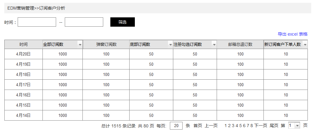 需求点2:要能查询不同时间段的用户订阅数据:,并可导出excel表格方便分析数据;