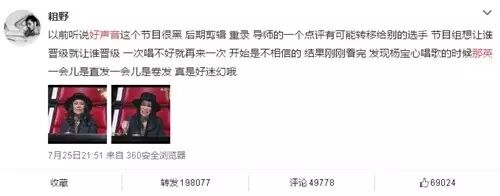 好声音之前就曾曝出同一选手演唱同一首歌的时候话筒颜色改变的bug,这次更是被网友指责存在作弊内幕。