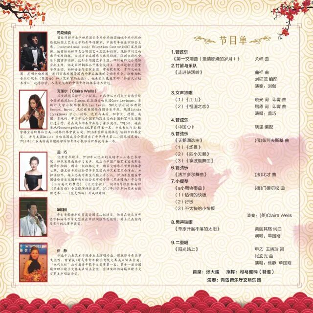 音乐会开场曲选择了凸显浓郁的中国民族音乐特色的管弦乐《关峡第一交响曲》,期间穿插经典管弦乐《天鹅湖选曲》《法兰多尔舞曲》和小提琴《a小调协奏曲》。同时,围绕“不忘初心,祖国颂”的主题还特意穿插了管弦乐《中国心》《我爱你中国》,独唱《江山》《祖国之恋》《草原升起不落的太阳》,二重唱《阳光路上》等红歌,整场演出曲目高亢、温馨、欢快、传承,是送给岛城人民和岛城乐迷的新年礼物,让大家在高贵优雅而又大气,具有东方韵致的音乐中感受新年的节日气氛。