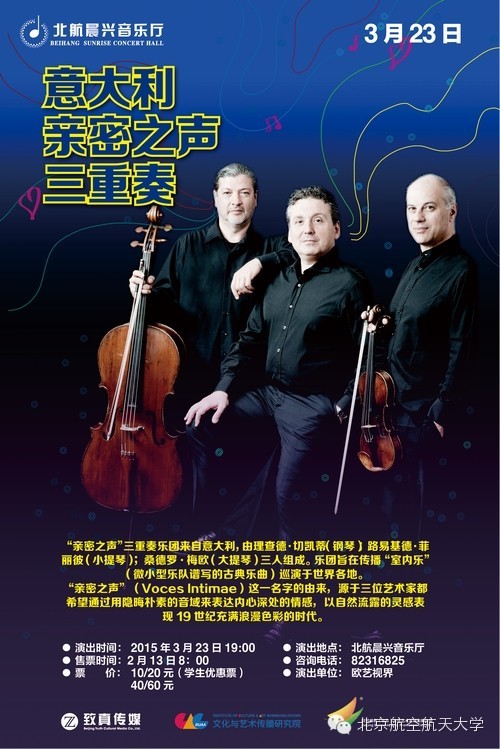 “亲密之声”三重奏乐团来自意大利,由理查德·切凯蒂(钢琴);路易基德·菲丽彼(小提琴);桑德罗·梅欧(大提琴)三人组成。乐团旨在传播“室内乐”(微小型乐队谱写的古典乐曲)巡演于世界各地。“亲密之声”(Voces Intimae)这一名字的由来,源于三位艺术家都希望通过用隐晦朴素的音域来表达内心深处的情感,以自然流露的灵感表现19世纪充满浪漫色彩的时代。