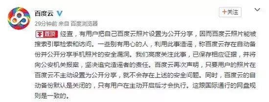 针对网友曝光的情况,百度云官方第一时间出面回应:在搜索引擎上搜索到某些用户的信息,是因为用户把自己百度云照片设置为公开分享。